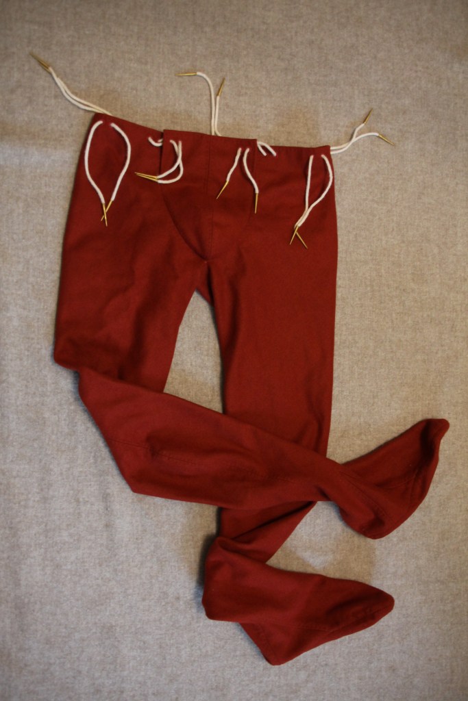 Bei der Hose handelt es sich um eine wollene Schamkapselhose mit inkludierten Füßlingen. Diese wird mit weißen Nestelschnüren aus Wolle direkt am Rüstwams befestigt. Sie unterscheidet sich nicht von zivilen Hosen der Zeit. Die Ausführung ist hochwertig und der Sitz nach einmaliger Korrektur perfekt.
