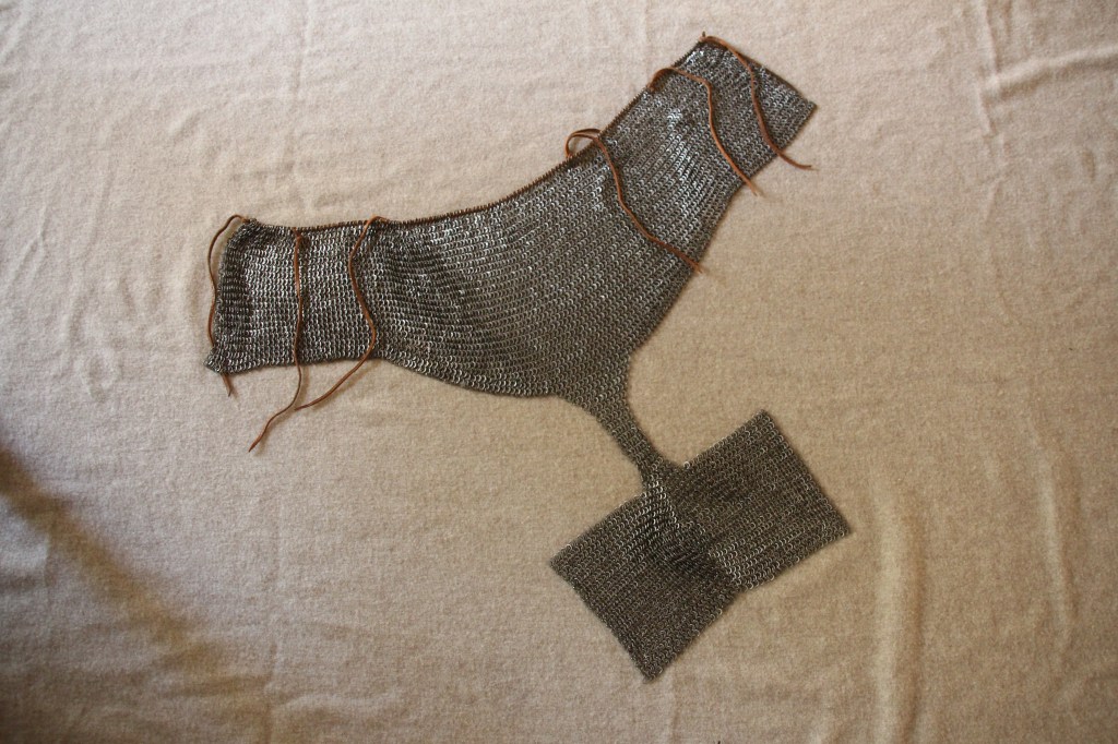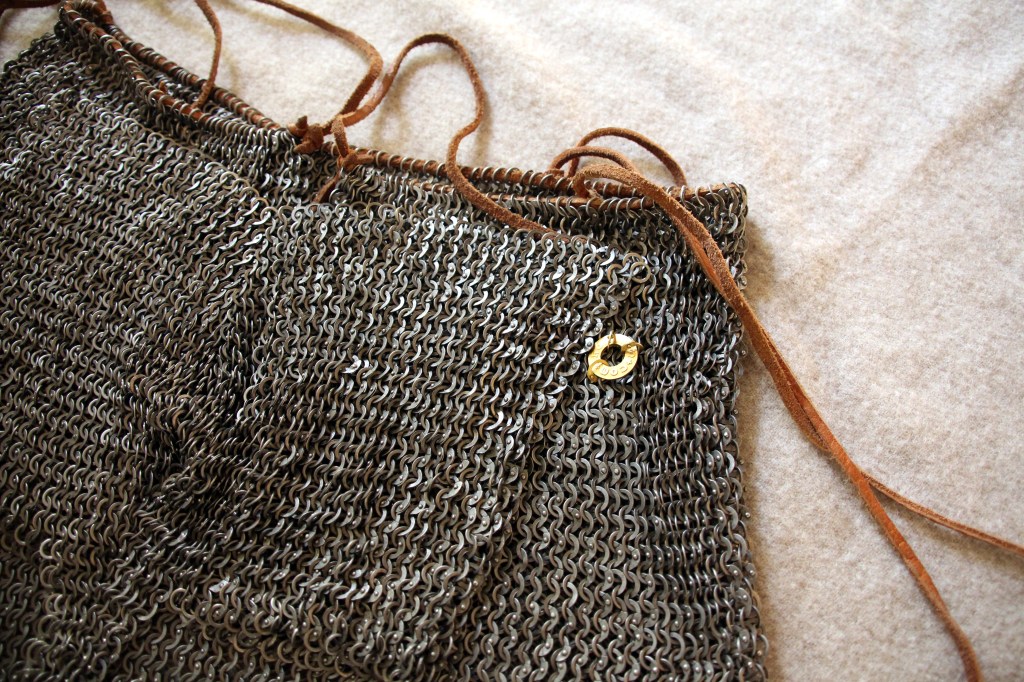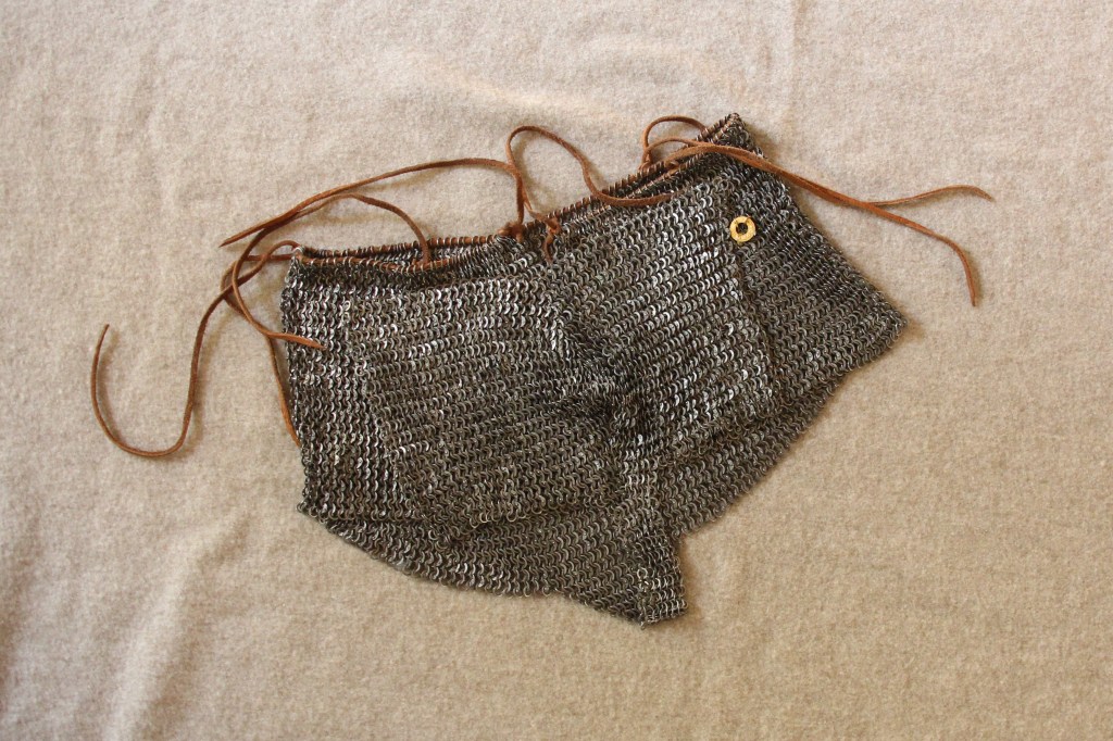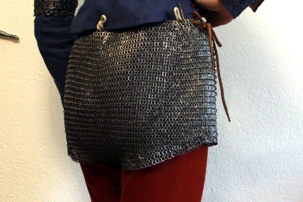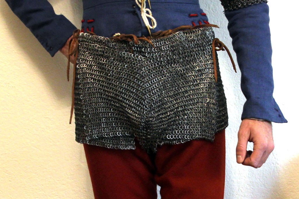 Die vom fantastischen Team Ironskin in Nürnberg gefertigte Brayette ist da. Diese Shorts aus Ringpanzergeflecht sind seit dem späteren 14. Jahrhundert belegt und stellen eine Alternative zu Ringpanzerröcken dar. Besonders beim Gefecht zu Fuß bedeckt eine Ringpanzer-Brayette den Unterleib eben mehr bzw. umfassender, als es ein Rock kann.